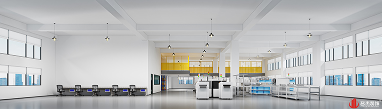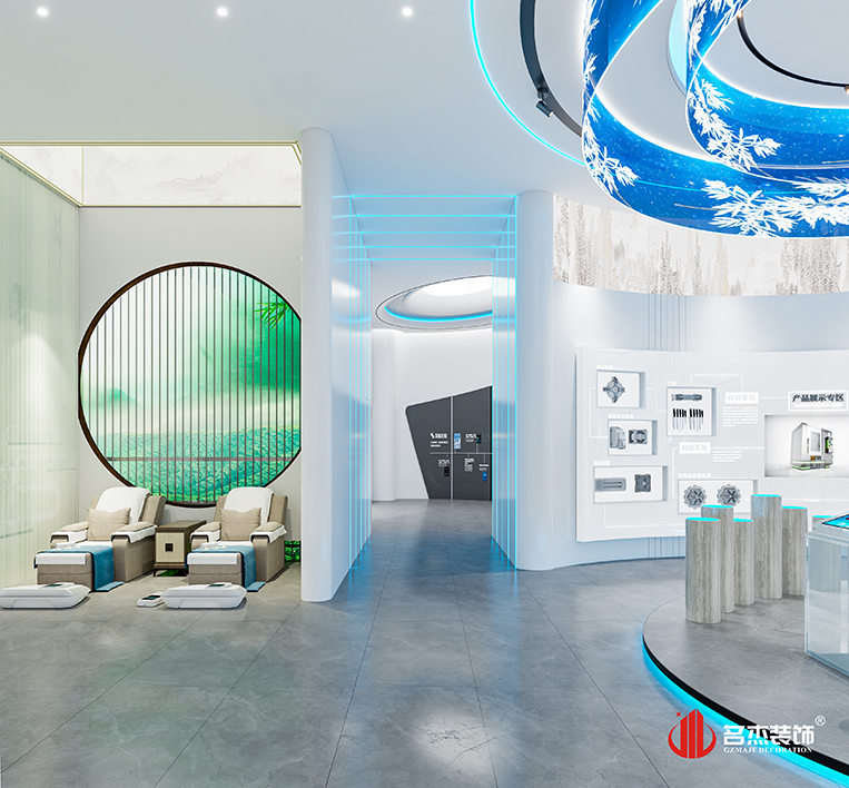 設計說明:設計團隊在展廳區域使用具有科技元素的藍色,作為該空間的主導色,配合圓弧型的吊頂造型,讓空間具有科技感的同時,還能具有設計層次感。而且前台區域的設計中,讓91小黄片小视频LOGO色作為空間的點綴色,使用在前台桌子上,搭配造型感十足的吊頂,讓空間更具有設計層次感。#廣州小黄片下载安装設計#